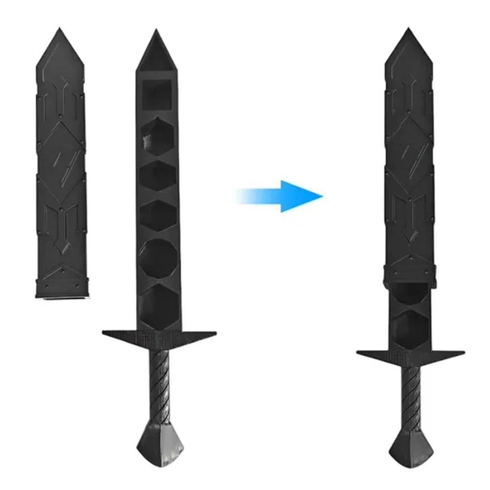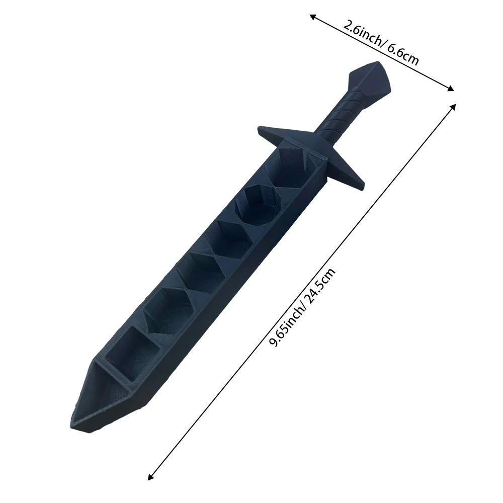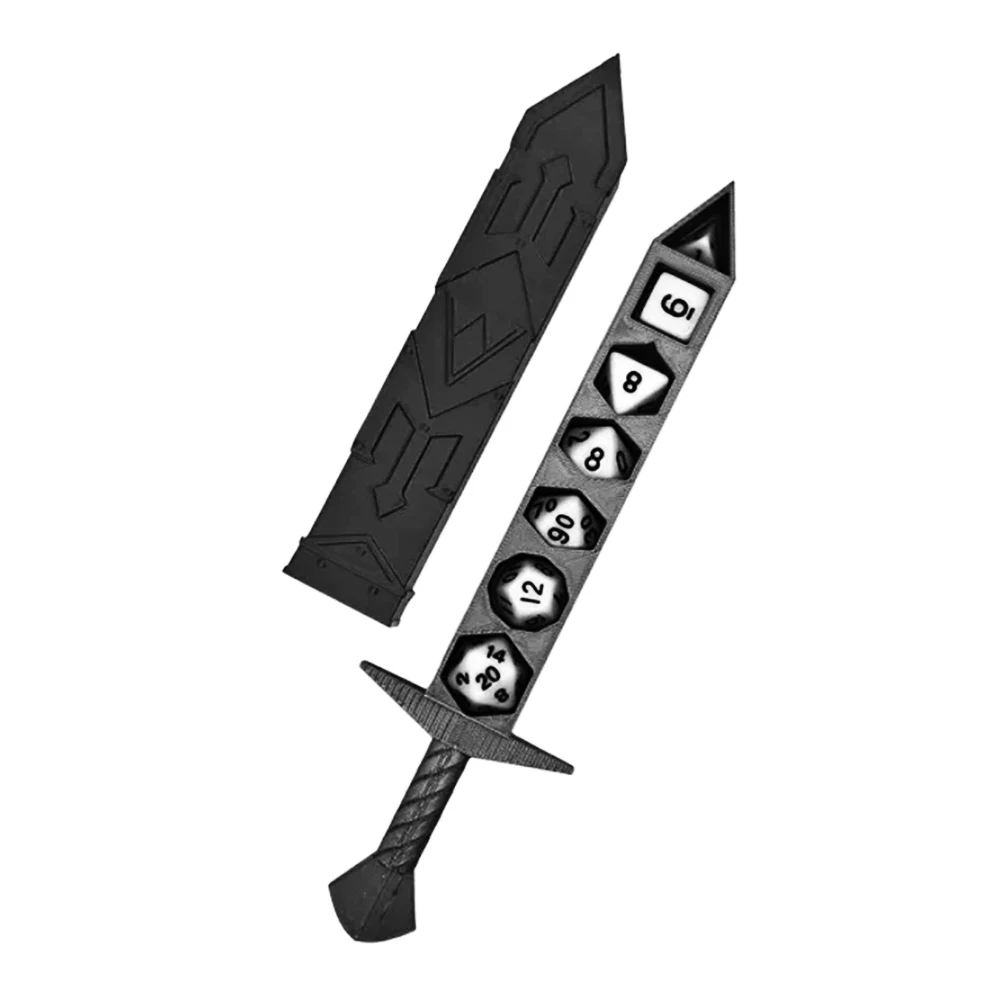 *This cool 3D printed black sword is a rigid plastic, with dice-shaped insets for a full set of dice, as well as a sheath to insert the dice tray into. Use them to display or carry your favorite set of dice.